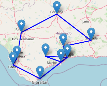 Malaga – Gibilterra – Cadice – Jerezde la Frontera – Siviglia – Cordova – Granada – Antequera – Malaga – Ronda – Mijas – Malaga